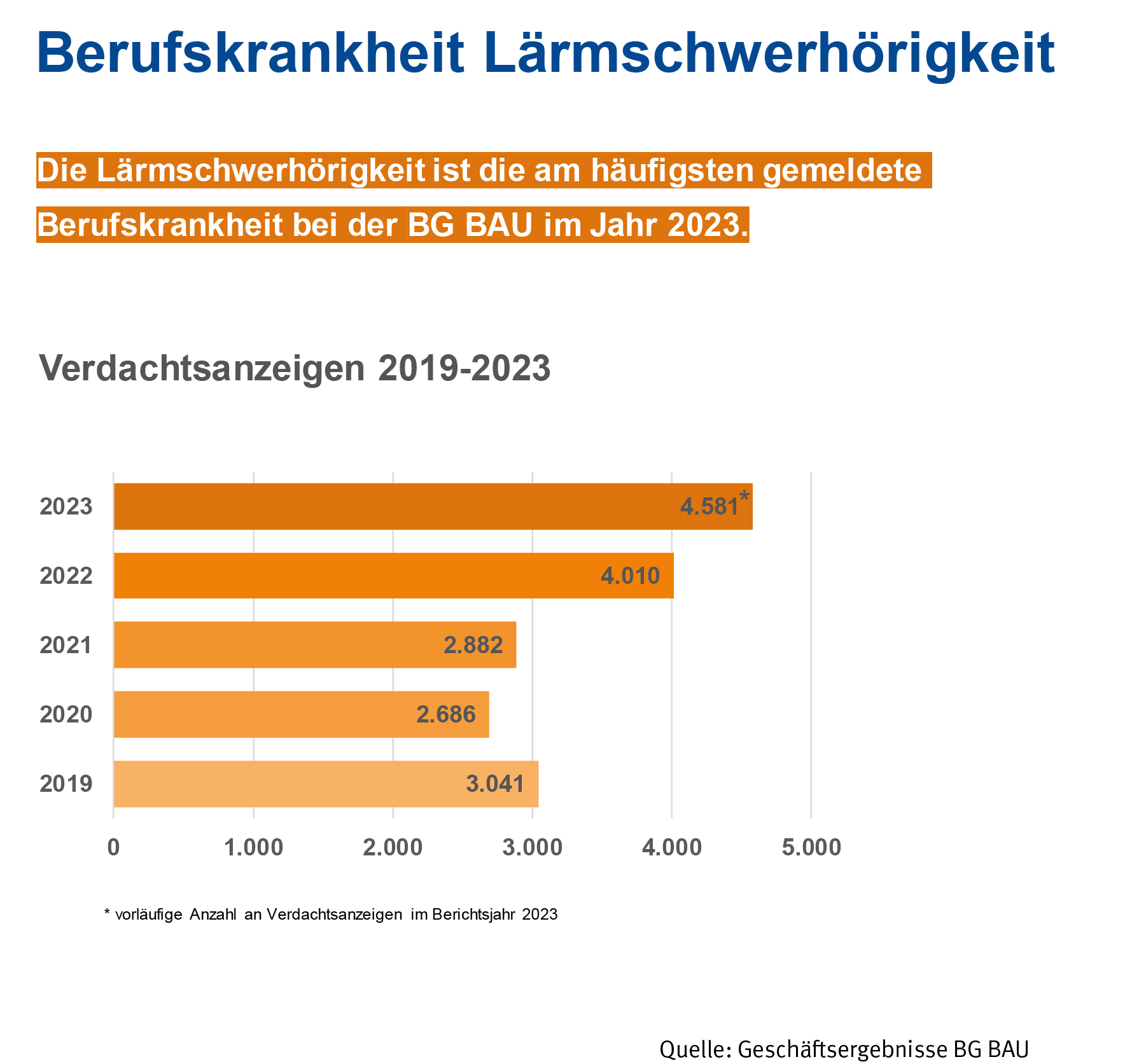 Auch wenn wir wissen, dass nicht nur im privaten Umfeld, sondern auch in der Arbeitswelt Lärm eine ständig wiederkehrende Gesundheitsgefährdung ist, das Gehör dabei irreversibel geschädigt wird, was wiederum zu Lärmschwerhörigkeit führen kann, steigt die Zahl der Verdachtsanzeigen wegen Lärmschwerhörigkeit.