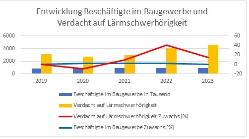 Diese Entwicklung ist zumindest bei Betrachtung der letzten fünf Jahre nicht mit der Entwicklung der Beschäftigtenzahl im Baugewerbe oder mit der Corona Pandemie zu erklären. Auch dass die Beschäftigten im Baugewerbe immer älter werden, erklärt den massiven Zuwachs an Verdachtsfällen nicht. Immerhin gab es 2023 fast um die Hälfte mehr Verdachtsfälle als 2019 und Lärmschwerhörigkeit kann auch junge Leute treffen.