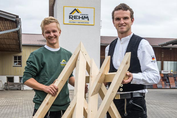 Niklas Grad (l.) hat bei der Gesellenprüfung Spitzenleistungen erreicht und wurde damit Bayerns bester Zimmerer! Sein Chef Simon Rehm hat 2015 den Weltmeistertitel geholt.